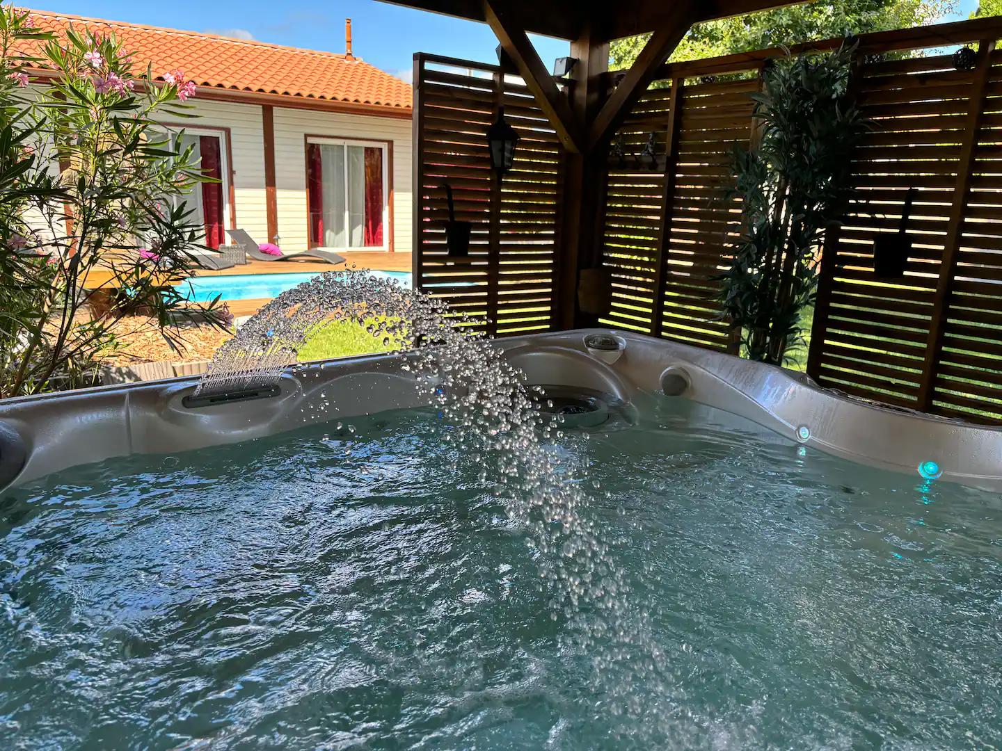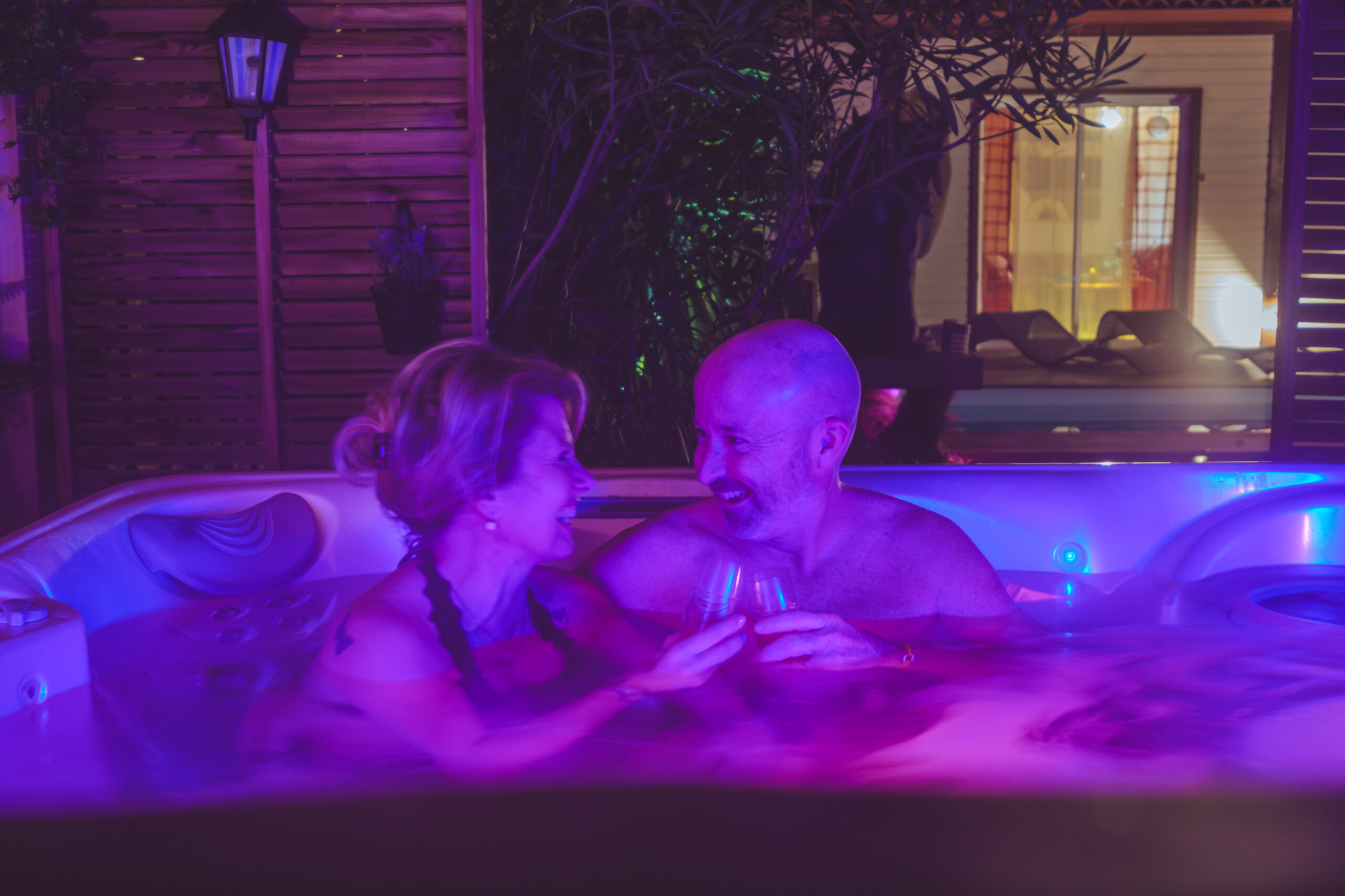 Profitez d’un jacuzzi extérieur privatif chauffé à 37°C toute l’année, parfait pour se détendre ensemble, de jour comme de nuit, sous les étoiles.
