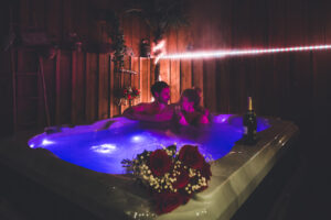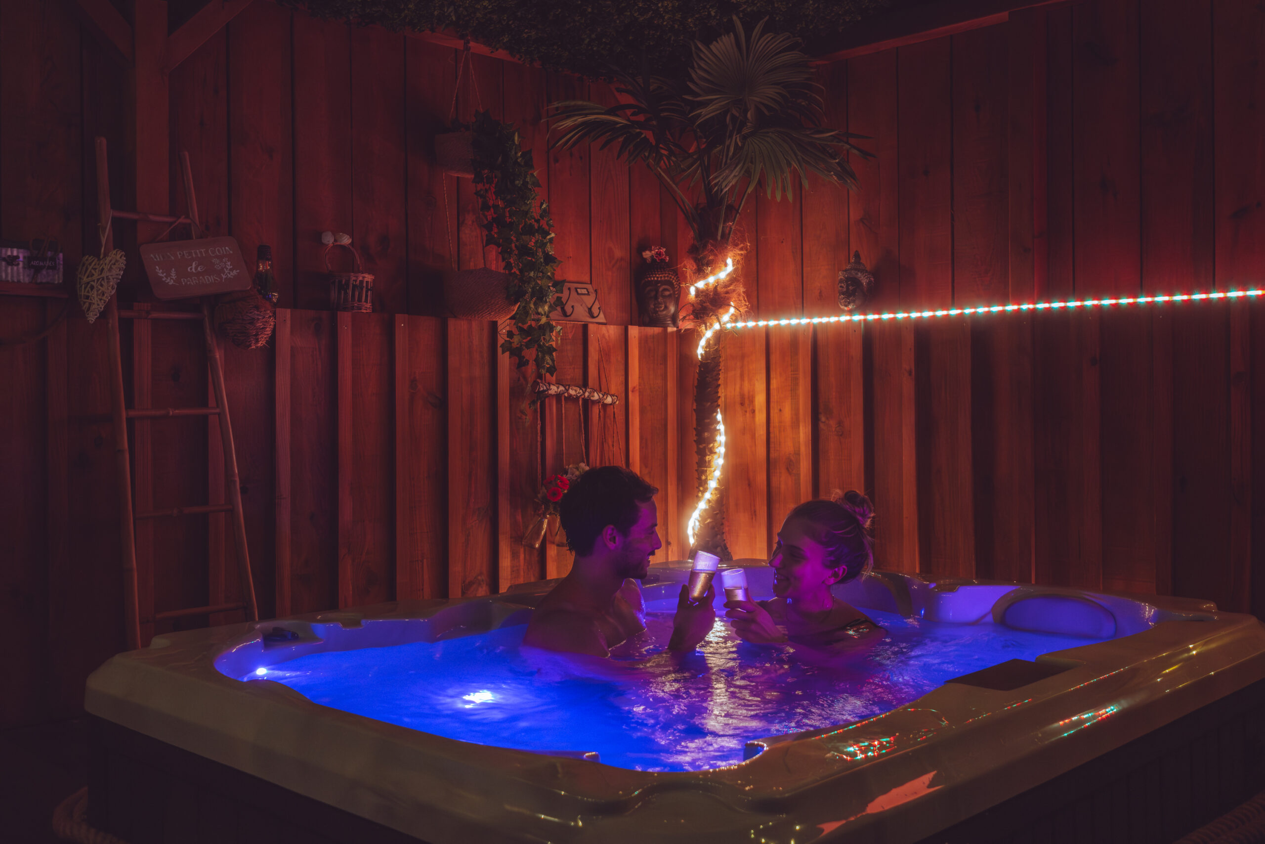 Son jacuzzi privatif, chauffé à 37°C toute l’année, pour savourer des instants de détente absolue en amoureux, bercés par le calme environnant.